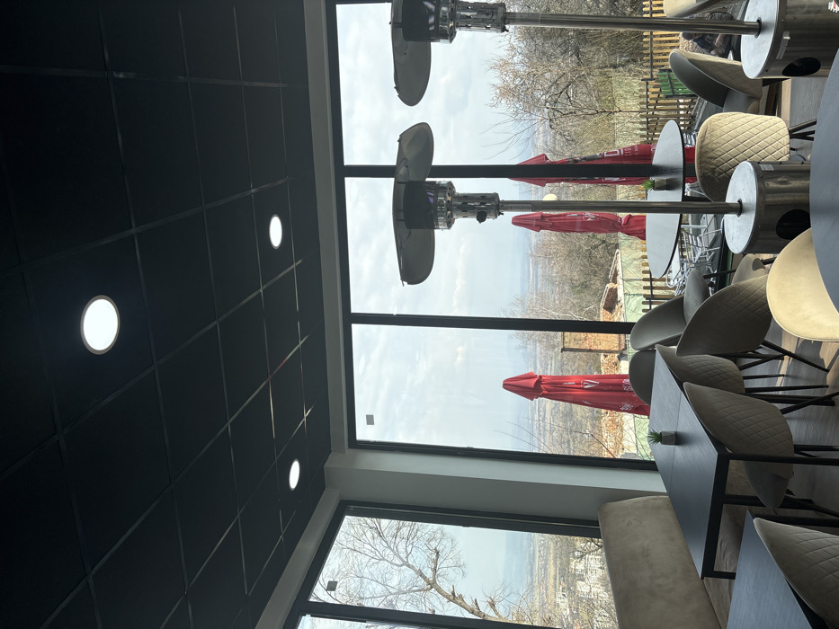 The image depicts the interior of an elevated establishment, likely a cafe or restaurant, offering a panoramic view of the city of Kyustendil, Bulgaria, situated in a valley. The indoor space features a black grid ceiling with three recessed circular LED lights. Expansive floor-to-ceiling windows on two walls provide the primary visual access to the exterior. The interior is furnished with contemporary pieces: several tables with dark, possibly wooden, tops and metal legs are present. Both rectangular and circular tables are visible. Light-colored, upholstered chairs, some with a quilted pattern on the back, surround the tables. A continuous light-beige upholstered bench seat is positioned along one wall beneath the windows. Small, artificial potted plants serve as minimalist centerpieces on some tables. No individuals are clearly visible inside the establishment. Through the windows, a wide landscape is observable under a partially cloudy sky. Immediately outside, an outdoor patio area is suggested by three red, folded large patio umbrellas. Two tall, silver-colored, stand-up patio heaters are prominently positioned near the windows, facing the outdoor area. A wooden fence marks the boundary of the immediate outdoor space. Beyond the fence, a sparsely vegetated hillside with bare trees descends towards the city below. Construction debris or rubble is visible on the hillside near the base of one red umbrella. In the distance, the urban sprawl of Kyustendil extends across the valley, flanked by hills or mountains. A single individual is vaguely visible in the outdoor area, seated partially obscured by a patio heater and the wooden fence, wearing a dark jacket. No specific actions or interactions are discernible from this individual.