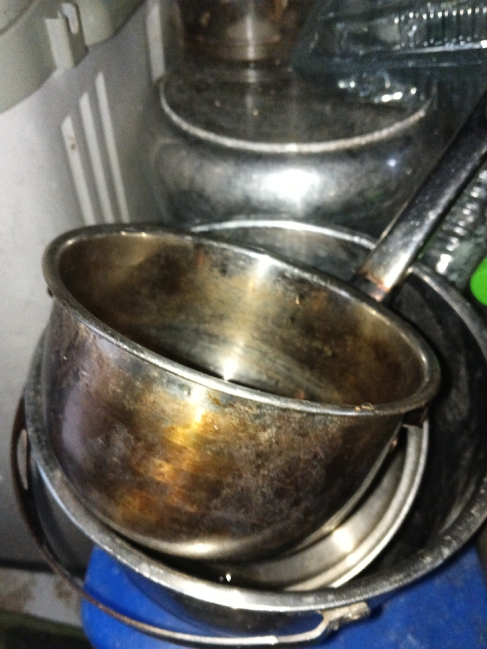 The image depicts a close-up, angled view of uncleaned metallic kitchenware, likely in a kitchen or storage area, in Kampung Buang Abai, Malaysia. Central to the foreground is a small, tarnished silver-colored saucepan, displaying significant dark brown and golden-orange discoloration or grime on its exterior surface. Its handle extends rightward, mostly out of frame. This saucepan is nested within a larger, dark metallic pot. The stack rests on a visible blue plastic object, likely a bucket, at the bottom of the frame. Further metallic containers or appliances are stacked in the blurred background, reflecting light. A pale, ribbed surface is visible on the far left. No individuals are present. The kitchenware exhibits substantial wear and residue consistent with prolonged use without cleaning.