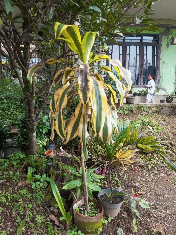 The scene depicts an outdoor residential environment in Ciherang, Indonesia. In the foreground, a tall, variegated plant with yellow and green striped leaves, exhibiting dark discoloration on its central stem and some leaves, stands in a moss-covered ceramic pot. Surrounding this plant are smaller potted plants, dense green foliage, and sparse ground cover on uneven, brown soil. To the left, a tree trunk with some moss is partially visible. In the background, a light green-painted house features large, multi-paned dark-framed windows. A young individual, dressed in light-colored long-sleeved clothing, stands on a raised concrete porch in front of the house, positioned to the right of the windows and looking towards the left. Several smaller potted plants line the edge of the porch.