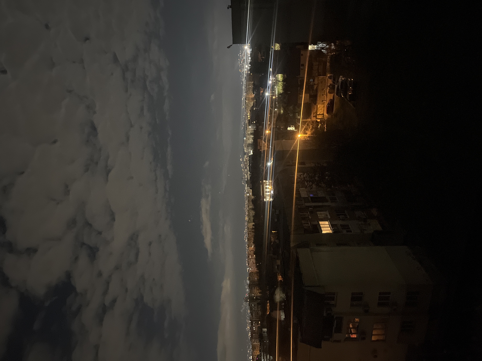 The image captures a nighttime cityscape, likely taken from an elevated position in Sofia, Bulgaria, as indicated by the urban environment and city lights. On the left side of the frame, a cloudy sky dominates, suggesting a dense cloud cover. The city lights are visible in the center, stretching out towards the horizon. Buildings are visible on the right, some with illuminated windows, indicating residential activity. Street lights cast a warm glow on the nearby areas. The right side of the frame is predominantly dark, obscuring details. The general impression is an urban night scene, with a contrast between the illuminated areas and the darkness.
