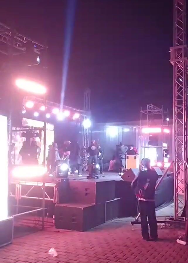 group of people performing on a stage at night. The stage has a metal frame around it with bright lights. A person stands to the side of the stage filming. The stage is set up in what appears to be an outdoor venue. The performers are obscured by the lighting and movement.
