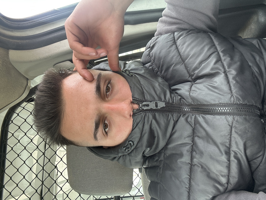 A young adult male is depicted seated inside a vehicle, located in the city of Srednia, Bulgaria. He has short, dark hair styled upwards and brown eyes, looking directly at the viewer. His face is partially obscured by a dark grey hooded puffer vest, which is fully zipped up to just below his nose. He is also wearing a grey long-sleeved garment under the vest. His left hand is positioned with the thumb and forefinger touching his forehead. Behind him, a grey fabric headrest and a black metal mesh partition are visible, consistent with a commercial vehicle interior. The background beyond the vehicle's interior is indistinct but appears to be an outdoor environment under overcast conditions.