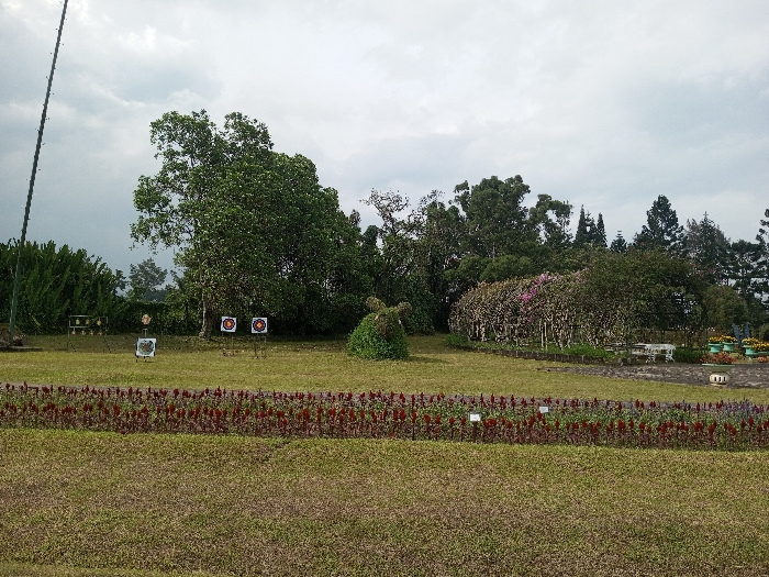 A wide-angle shot captures a park scene under a cloudy sky. A vibrant bed of red flowers lines the foreground. Beyond, manicured grass extends towards a cluster of trees and bushes. Several archery targets are positioned in the grass before the trees. A bush shaped like an animal sits mid-ground. Additional greenery and trees fill the background.