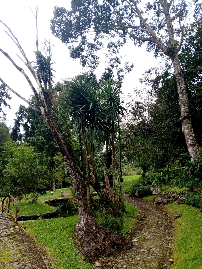 A lush green landscape features a mossy stone path splitting around a gnarled tree. A small bridge crosses a winding water feature to the left. Tropical-looking plants with spiky leaves stand amidst a dense forest of various trees. The scene is overcast, with a muted, slightly grey sky visible through the branches. The overall impression is one of a tranquil, slightly overgrown botanical garden.