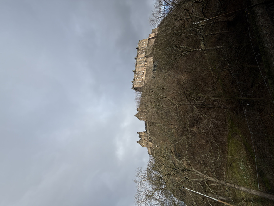 The image depicts Edinburgh Castle, located in the City of Edinburgh, United Kingdom, situated atop a prominent, tree-covered hill known as Castle Rock. The sky is overcast with varying shades of grey clouds dominating the upper two-thirds of the frame. The castle itself, a large stone edifice with multiple sections, battlements, and windows, occupies the upper-middle ground. Its stone facade appears light brown or tan. The steep slopes of Castle Rock are densely covered with numerous bare deciduous trees, their dark, intricate branches contrasting against the lighter castle stone and sky. In the lower left foreground, a vertical metal pole is partially visible. Segments of a dark metal fence or railing are present along the bottom edge, with patches of green and brown ground vegetation, including small white flowers, visible on the lower slopes. No individuals are present.