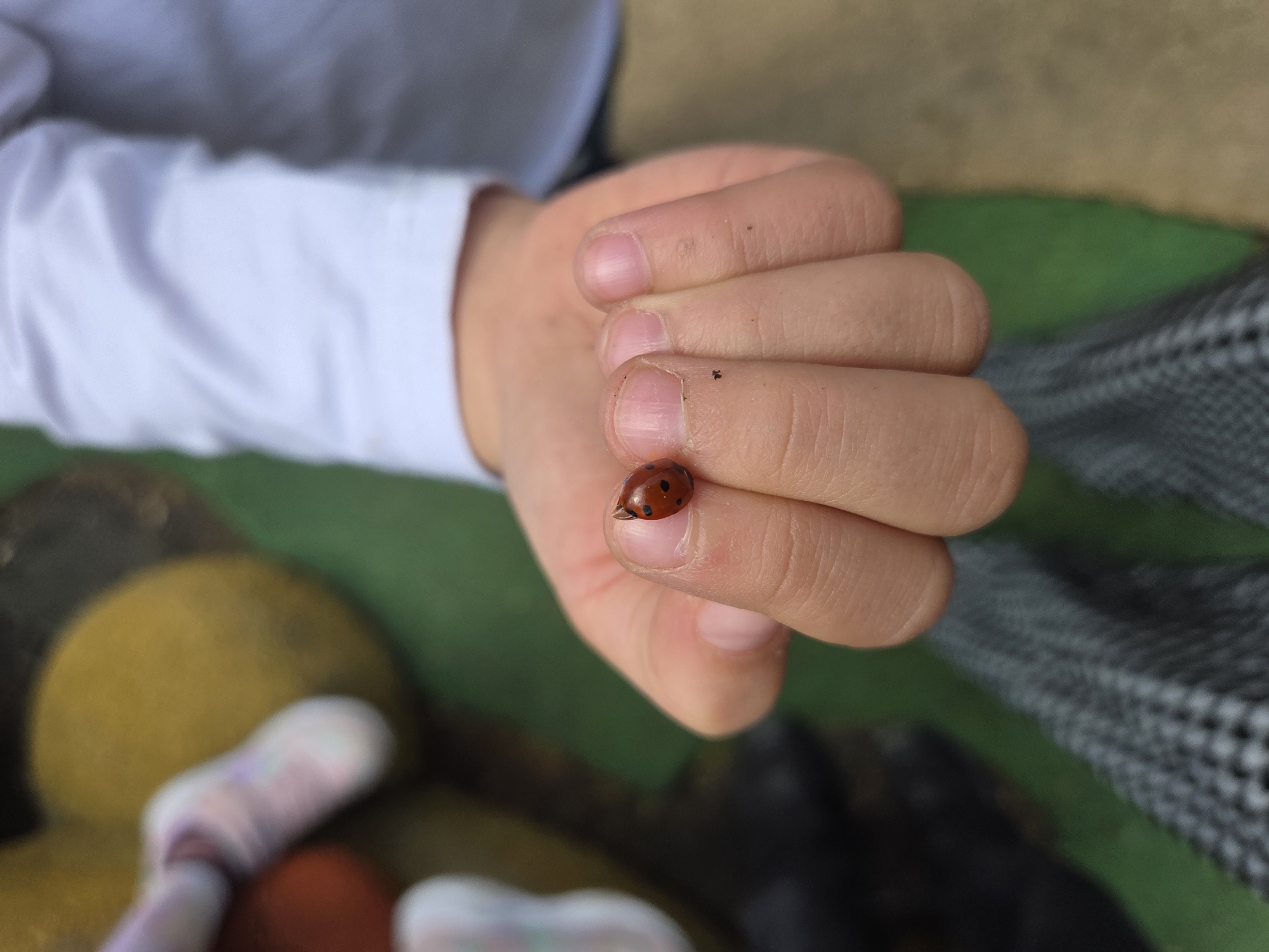 - "A child's hand holds a ladybug on the tip of a finger" by FM-5o4p43, licensed under CC BY 4.0
