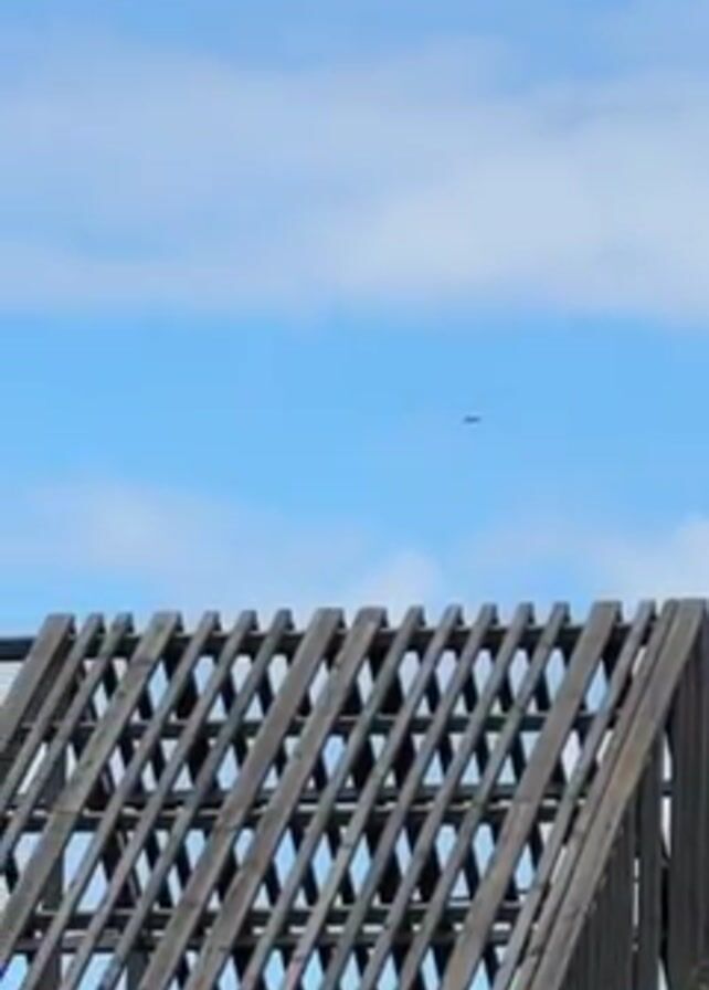 top of a dark gray roof structure under a bright blue sky with a few scattered clouds. The roof is made of wooden beams arranged in a lattice pattern. In the distance, a small dark airplane is flying across the sky. A power line and some foliage are visible on the right side of the frame.