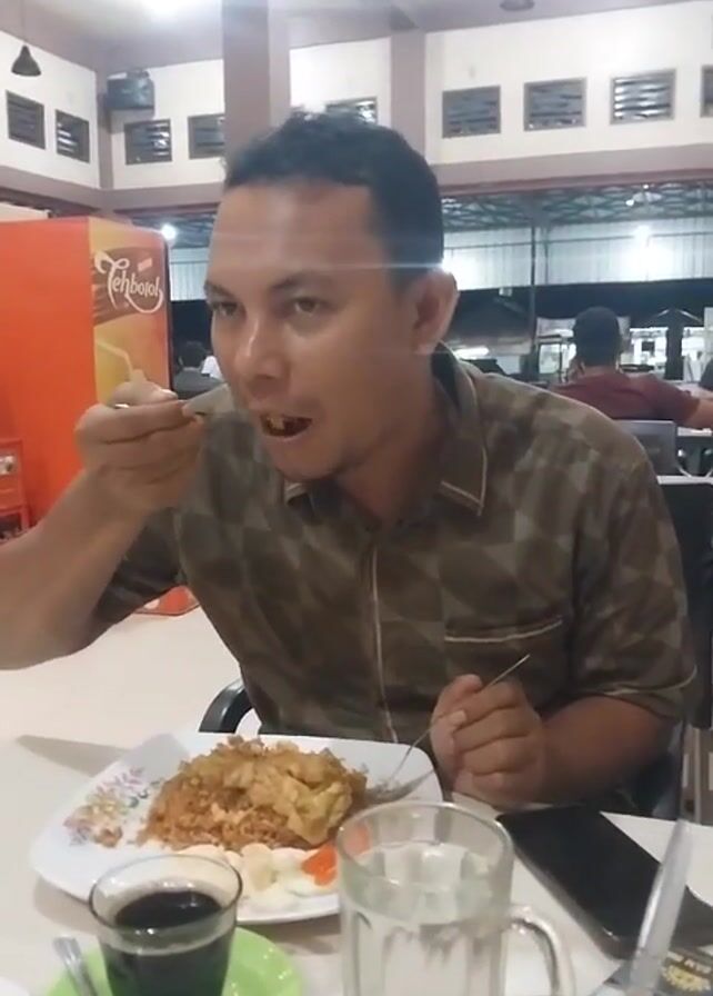 A man is sitting at a table in a restaurant, eating a meal with a spoon. On the table, there is a plate of food that includes what looks like fried rice and fried chicken, along with garnishes. There is also a glass of dark liquid, a glass of water, and a pack of cigarettes. The man is wearing a patterned shirt. In the background, there are other people dining and an orange drink dispenser. Someone gives a thumbs up at the end of the video.