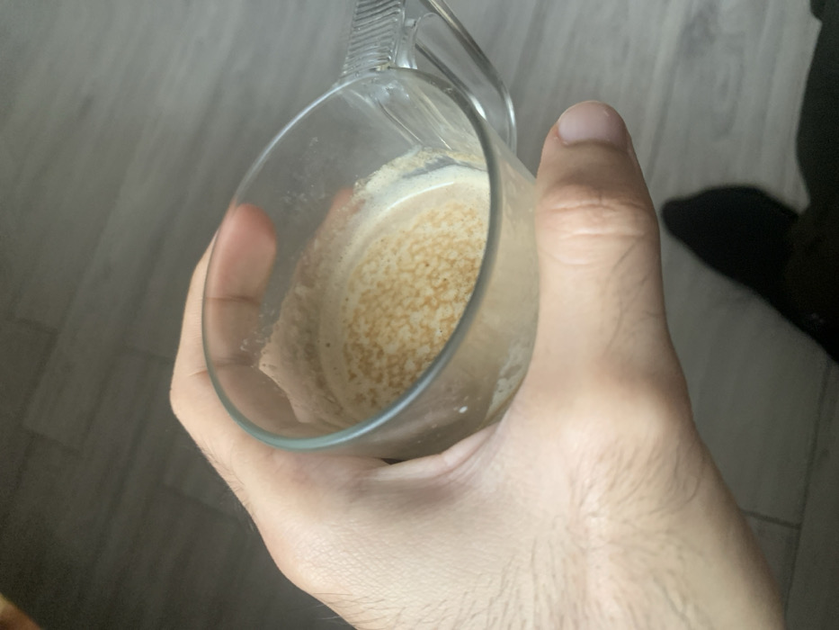 A human hand, exhibiting a light to medium skin tone and fine hair on its dorsal surface, holds a clear glass mug. The mug features a ribbed handle and contains a light brown liquid topped with a frothy, speckled surface composed of numerous darker brown, irregular dots. The liquid level is approximately two-thirds full. In the lower right background, a foot or lower leg clad in a black sock is partially visible. The immediate environment consists of a light-toned wooden floor with visible planks and grain patterns, indicating an indoor setting in Goliam Izvor, Bulgaria.