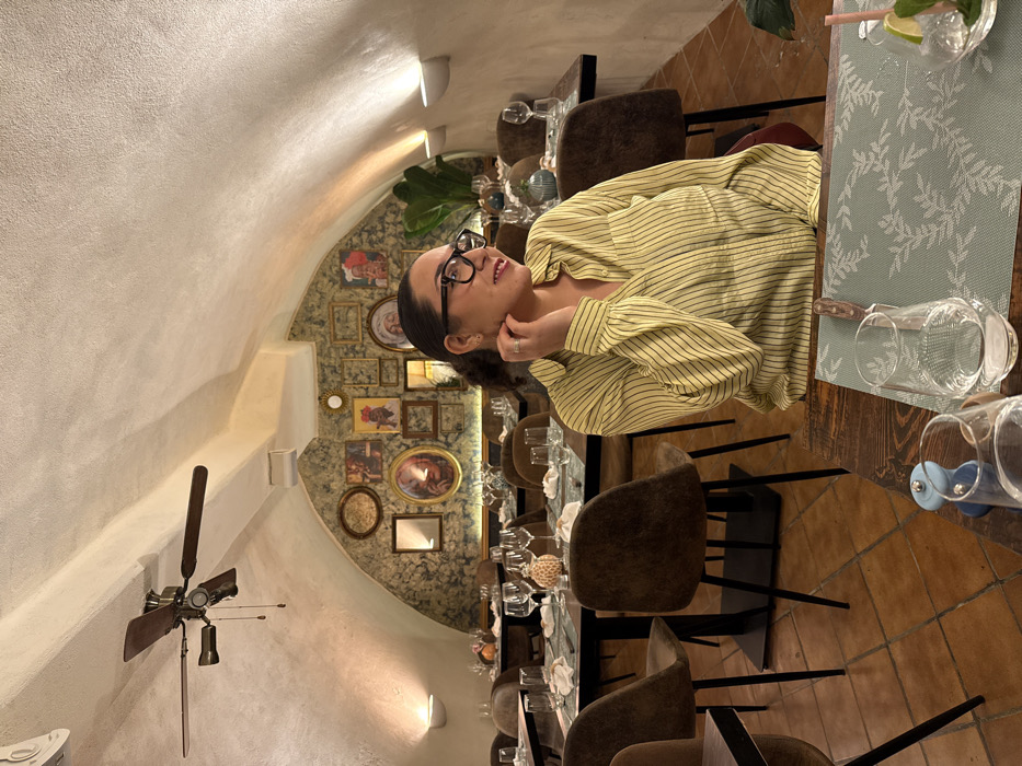 The image depicts the interior of a restaurant in Aix-en-Provence, France, characterized by a vaulted, off-white ceiling and a terracotta-tiled floor. A woman, with dark hair pulled back, wearing black-framed glasses and a light yellow vertical-striped button-up shirt, is seated at a wooden table in the foreground. She exhibits a subtle smile, looking toward the right out of frame, with her right hand raised, fingers touching her ear, and a ring visible on her right ring finger. On her table are a light blue placemat with a leaf pattern, two clear glasses (one containing water), a small blue-and-wood salt/pepper grinder, a knife, and a partially visible glass with ice and lime. The restaurant is furnished with multiple rectangular dark wooden tables and dark brown upholstered chairs; all tables are set with similar placemats, white napkins, and various types of glassware, indicating readiness for service. The far wall features a textured, dark patterned wallpaper serving as a backdrop for a densely arranged collection of framed artwork and mirrors of assorted sizes and shapes. Overhead, a brass and dark wood ceiling fan with light fixtures is mounted. The scene is softly illuminated by wall-mounted uplights highlighting the ceiling arches. A large green leafy plant is visible among the background tables.