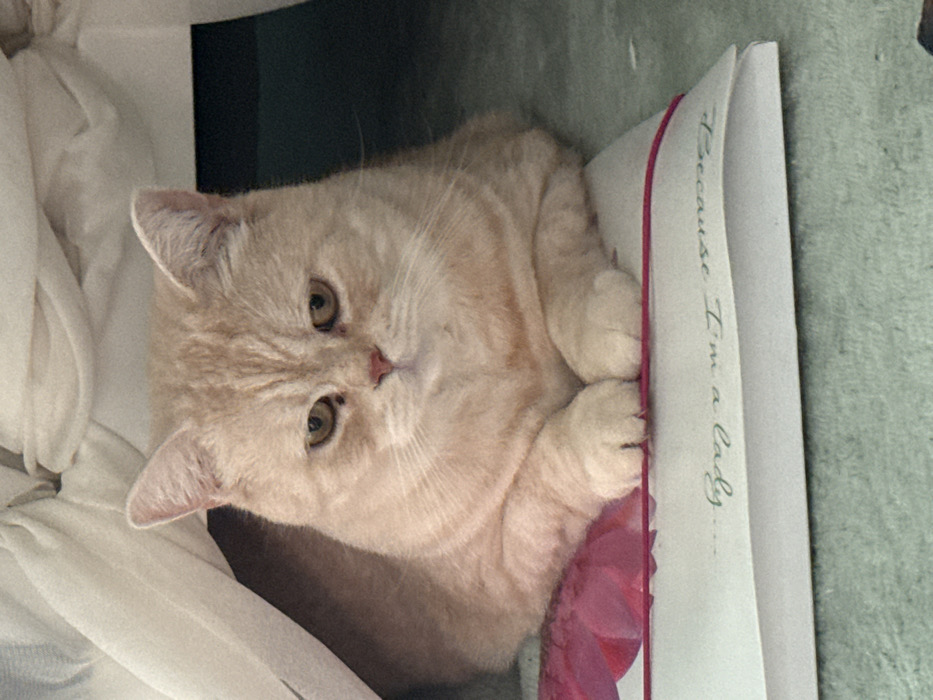 A cream-colored domestic cat, consistent with a British Shorthair breed, is depicted resting in an indoor setting