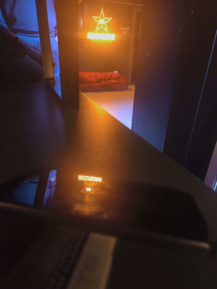 A dark interior room features a glowing neon sign displaying "ROCKSTAR ENERGY DRINK" with a star logo. The light reflects off a glossy surface, mirroring the signage. A red beanbag chair sits in the background, adding a pop of color to the mostly dark setting. The composition focuses on the play of light and reflection.