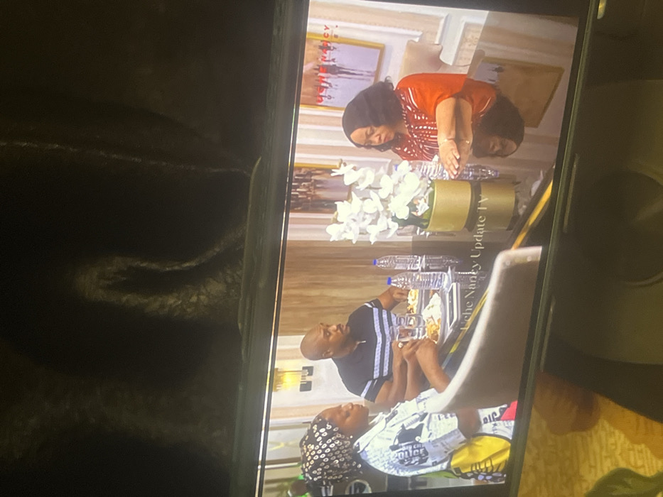 Three people are seated around a table. A woman in a red shirt and head covering sits across from a man in a black and white striped shirt and a woman in a patterned head covering. A floral arrangement sits at the center of the table alongside water bottles, plates, and food. Art hangs on the wall behind the seated people. Text is visible on the screen, reading "Liche Nancy Update TV." The image appears to be taken of a television screen.