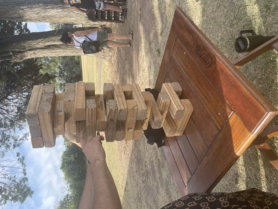A Jenga tower sits on a wooden Coca-Cola branded table outdoors