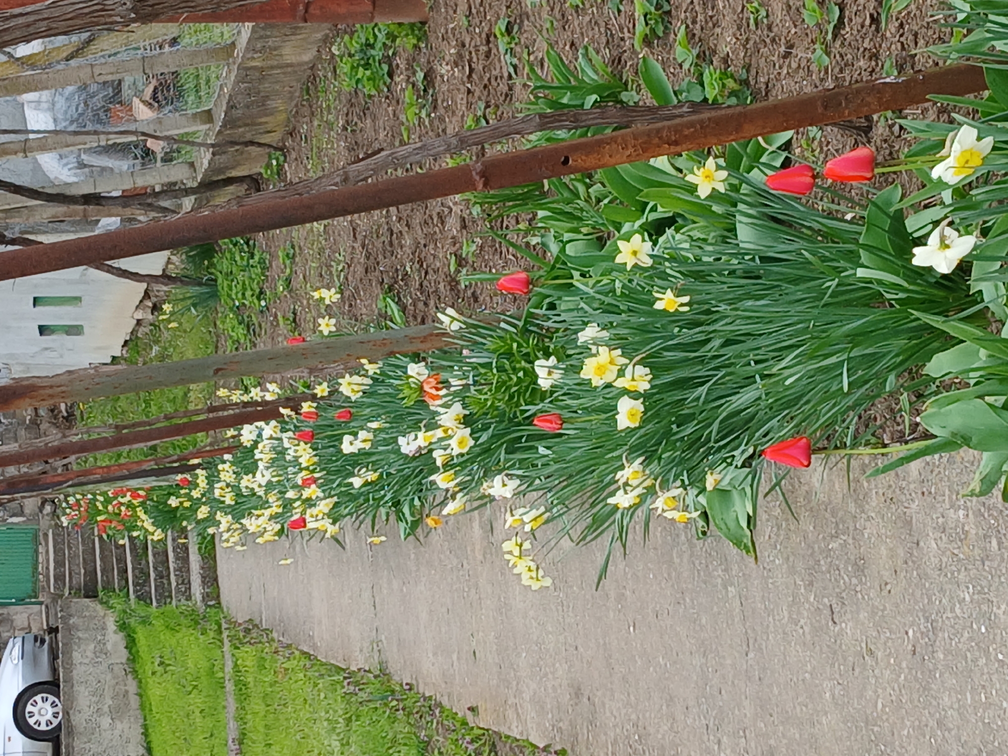 garden path in Banitsa, Bulgaria. The path is made of concrete and has a border of grass on the left and a flower bed on the right. The flower bed is full of daffodils and red tulips. A rusty metal structure runs along the edge of the flower bed. Steps lead up to a green door in the background. A white car is parked on the left.