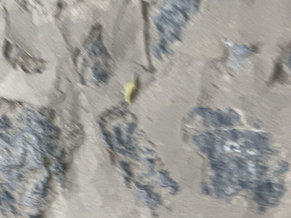 The scene captures an extremely blurred, close-up view of a textured surface, displaying areas of light beige and irregular, mottled patches of desaturated blue-gray. A single, distinct, elongated object, yellow in color and approximately 1-2 centimeters in length, is visible towards the upper right quadrant. No discernible individuals, specific objects beyond the yellow item and surface texture, or actions are depicted. The environment appears to be an indistinct, textured flat plane. The image provides no visual information to ascertain its specific location within Hoa Lư Ward, Vietnam.