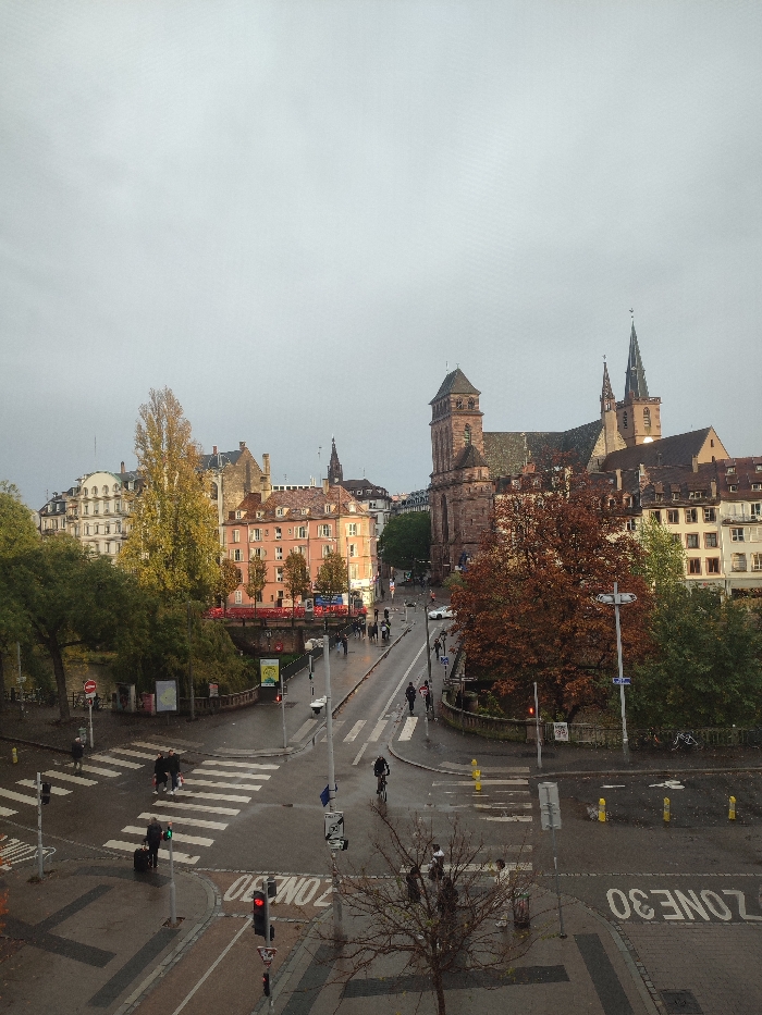 An aerial view captures an urban street scene in Strasbourg, France, under an overcast sky with wet road surfaces