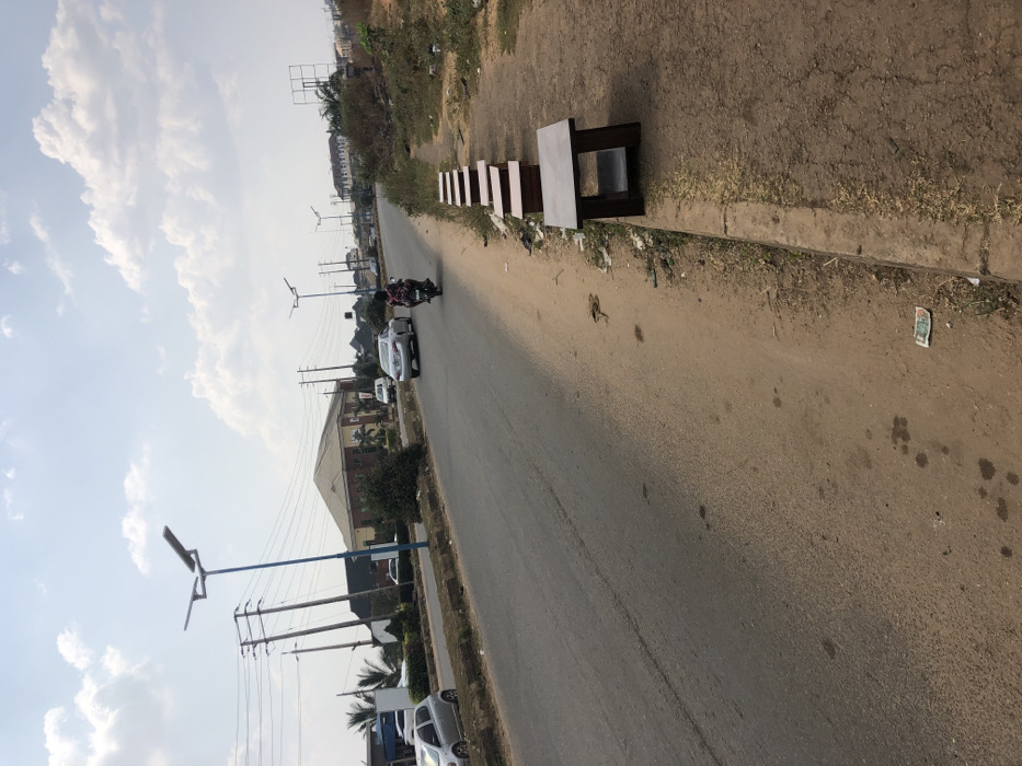 The image depicts a multi-lane asphalt road in Oshogbo, Nigeria, extending into the distance under a sky with scattered white clouds. The perspective is from a slightly elevated position on the right side of the road. On the immediate right, a dirt shoulder runs parallel to the road, separated by a concrete curb. Eight identical dark-brown stools with light gray tops are neatly arranged in a linear fashion on this dirt shoulder, facing the road. The unpaved ground surrounding them contains sparse, dry vegetation and scattered debris, including a crumpled piece of paper, possibly currency, near the curb. On the road, a black motorcycle with two occupants (a driver and a passenger) travels away from the viewer. Further in the distance, a silver sedan also drives away. On the left side of the road, a white compact car is parked, partially obscured by a concrete median strip. The environment includes multiple blue-poled streetlights equipped with solar panel arrays, lining both sides of the road. Several wooden utility poles with numerous power lines are visible on the left side. In the mid-ground on the left, a building with a light-brown hip roof stands among other structures. On the far right, a large, empty metal billboard frame is visible atop a distant rise. The surrounding landscape features dry, sparse vegetation and unkempt ground beyond the road infrastructure.
