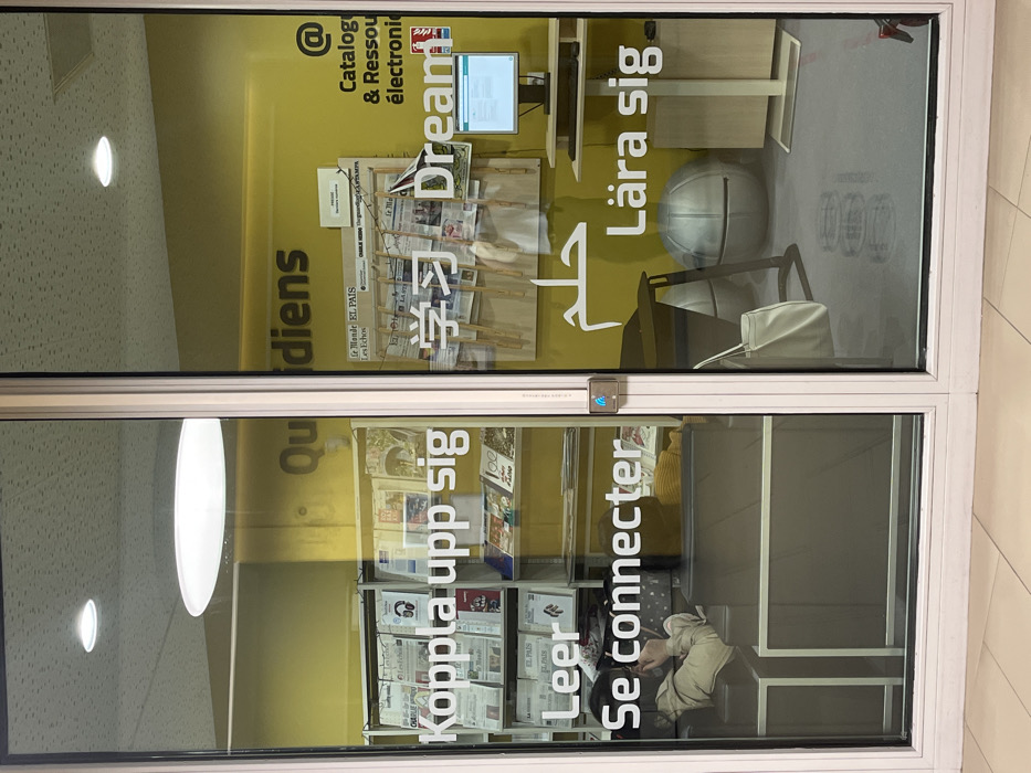 This image captures the glass entrance of a modern médiathèque (media library) located in Roubaix, France