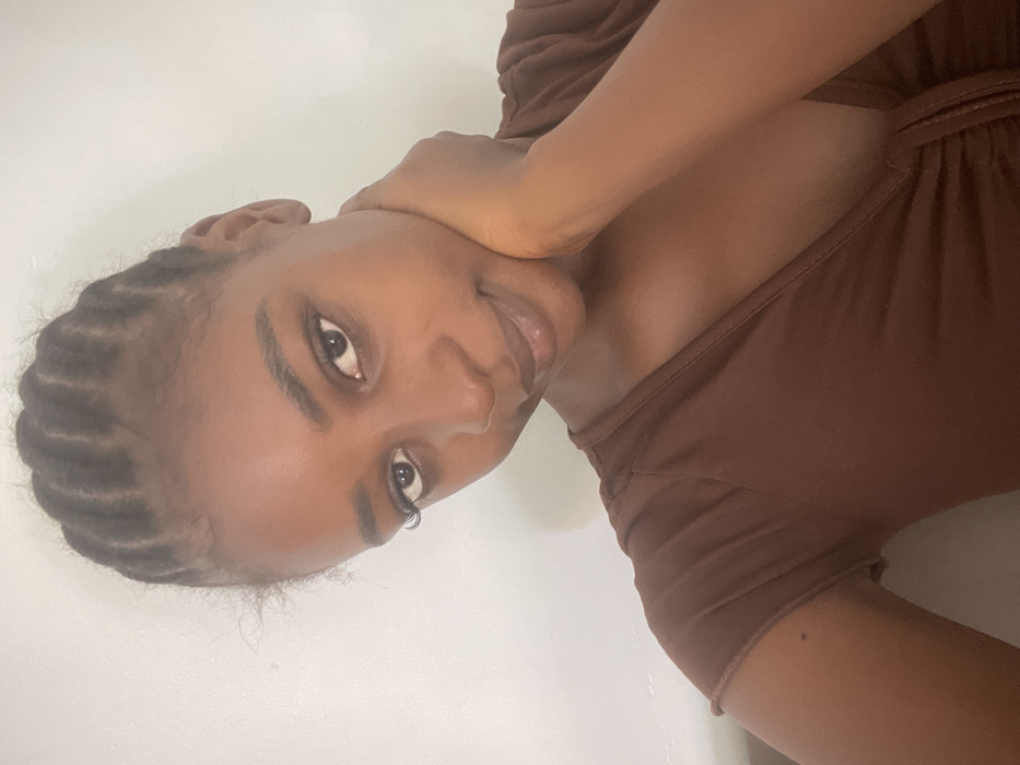 A young adult female with dark skin and dark hair styled in cornrows is depicted in a close-up, chest-up shot
