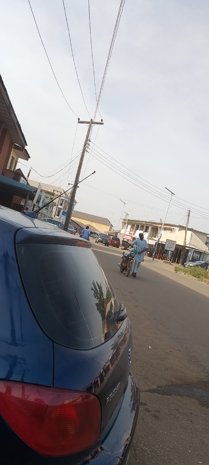 A street scene is captured, with a blue Peugeot car taking up the foreground. In the midground, a man in a light-colored robe walks alongside a motorbike. Other vehicles and pedestrians are visible further down the street. Buildings line the road, with signs indicating businesses. Utility poles with power lines stretch across the sky, adding to the urban environment. The lighting suggests it's daytime, with a slightly overcast sky.