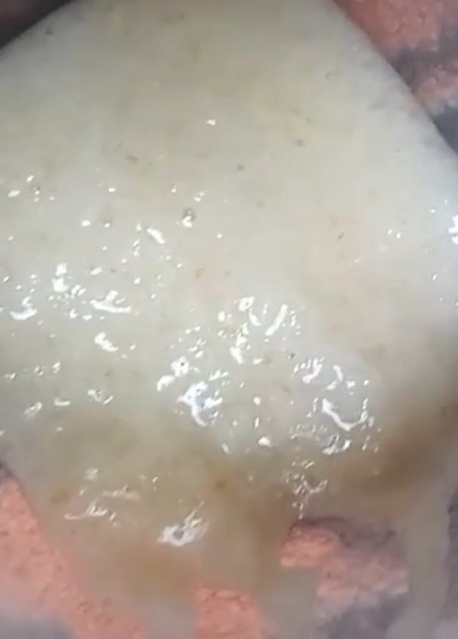 The video displays a close-up shot of a translucent container holding a thick, beige, semi-liquid substance with visible grains