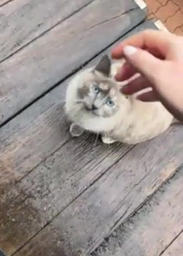 A video shows a light-colored cat with dark markings on a weathered wooden surface