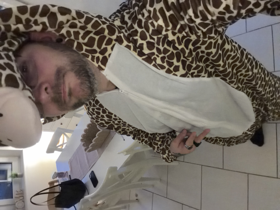 A person wearing a giraffe onesie poses for a selfie. The individual has a beard and is wearing rings. The background features a white kitchen table with chairs, a handbag, a phone, and decorative items. Tiled flooring is visible, along with a window letting in natural light.
