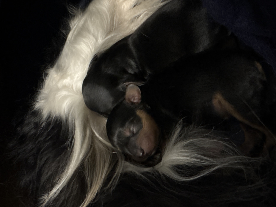 - "Two neonatal canines are depicted in a resting state, nestled against a larger canine" by FM-jgPhH3, licensed under CC BY 4.0