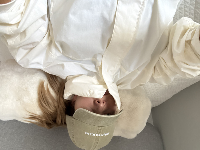 From an elevated perspective, a person reclines on a white, quilted bed, obscured by a cream-colored jacket and a tan baseball cap. The cap features "Binoculus" embroidered in white. The person rests on a plush, textured pillow of similar cream tone. A portion of gray flooring is visible beneath the bed. The individual's face is partially covered by the jacket. Her hair is light brown.
