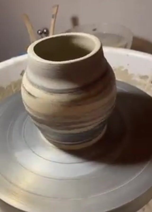 medium shot of a ceramic pot on a pottery wheel. The pot has a simple, rounded shape with a narrow opening at the top. It features a swirled pattern of light and dark clay, resembling a marble effect. The wheel is spinning slowly, showcasing the pot's circular design. The background is blurred, but it appears to be a pottery studio, with tools and supplies visible. The lighting is soft and diffused, highlighting the texture and color variations in the clay.