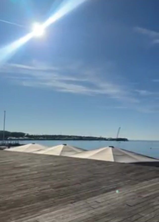 sun-drenched, seaside view from a wooden deck. The camera pans slowly from left to right, showing closed white umbrellas with a distinctive peak design. Beyond the umbrellas, the calm, blue sea stretches to the horizon under a clear blue sky with wispy clouds. In the distance, a marina with boats and a crane can be seen. The sun is bright, causing glare on the camera lens.