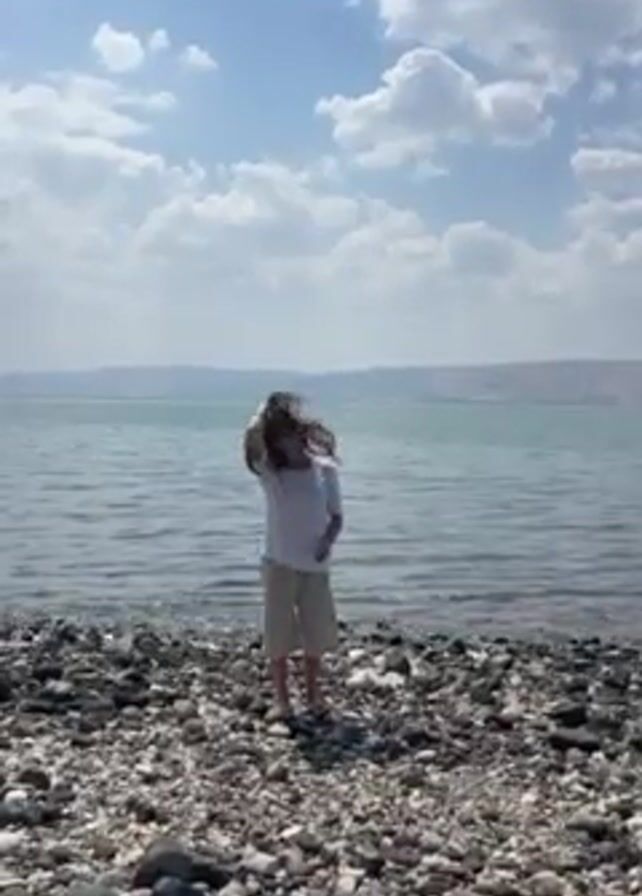 A woman stands on a rocky beach next to a calm body of water under a partly cloudy sky. She is wearing a white top and tan shorts. She moves her hair away from her face and then stands still, looking toward the camera. The water is a light turquoise color, and there is land visible in the distance across the water. The beach is made up of dark-colored rocks.