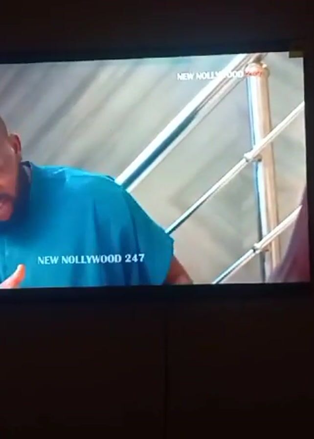 A man wearing a teal shirt is speaking to a woman off-screen, followed by a shot of a woman with long black hair and a patterned shirt standing next to a young man with curly black hair wearing a white shirt. The scene is from a television set, and the channel is labeled "NEW NOLLYWOOD 24/7". The wall is dark.