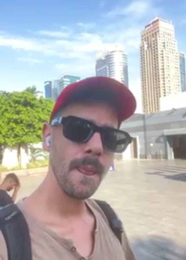 man outdoors in a city environment. He is wearing a red baseball cap, sunglasses, a beige t-shirt, and a backpack. He has a beard and is sticking his tongue out slightly. There are tall buildings in the background, and a few other people visible at a distance. The sky is blue with scattered clouds. The area appears to be a paved plaza.
