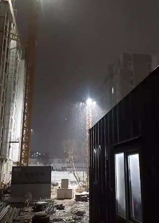 nighttime construction site during a snowfall. Two tall yellow cranes stand prominently amidst buildings and other structures. The site is illuminated by bright lights, making the falling snow visible. A man is seen walking across the site in the distance. A dark shipping container is visible in the foreground, with a lit window. The ground appears muddy and covered with construction materials.