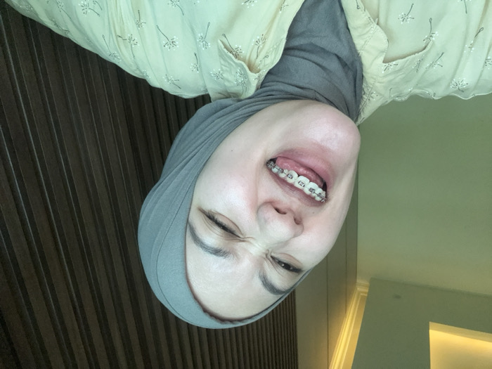 A woman wearing a hijab and braces poses with a playful expression