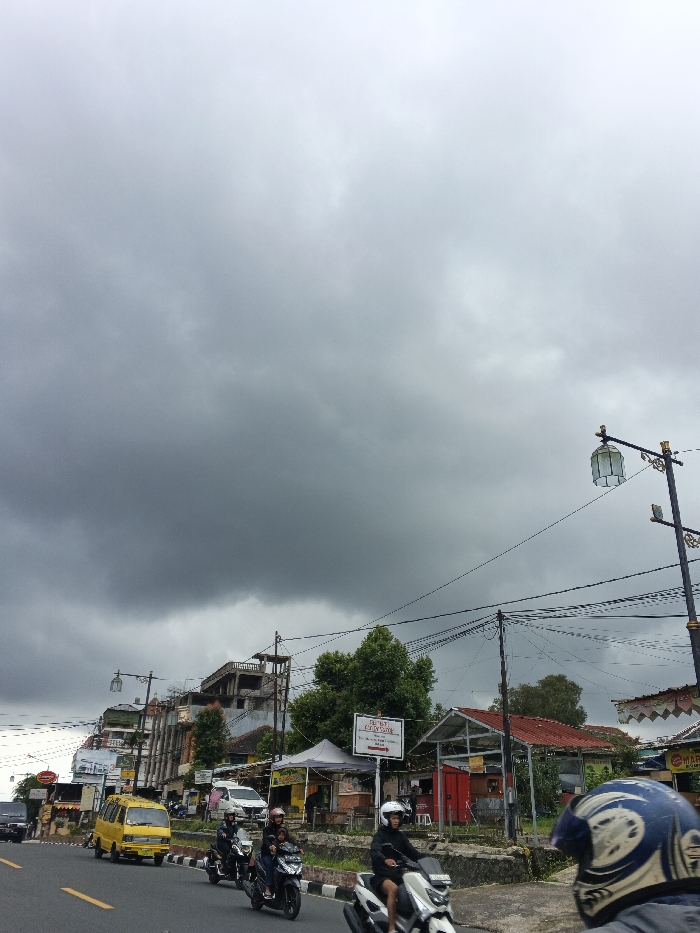 The image depicts an urban street scene in Palayan, Philippines, under a heavily overcast sky. The upper two-thirds of the frame are dominated by dense, dark grey clouds, indicating overcast weather. In the foreground, the back of a person wearing a blue and white motorcycle helmet is visible on the far right, facing away from the viewer. The asphalt road occupies the lower left and central portions of the image, marked by a solid yellow line on the left edge. Traffic is present, with multiple motorcycles traveling away from the viewer. A white scooter with a single rider wearing a white helmet is prominent in the lower right, followed by a dark scooter carrying two individuals (driver and passenger). Further back, another dark scooter with two riders is visible. A yellow passenger van is seen traveling in the opposite direction on the left side of the road, with a dark sedan partially visible behind it. The roadside on the right features a concrete barrier separating the road from a raised area where commercial structures are situated. These include a white tent, an adjacent structure with a red roof, and a visible sign bearing the text "BUKIT CINTA" (partially obscured), mounted on a pole. Numerous utility poles with a complex network of overhead black wires crisscross the scene. A decorative streetlight, featuring a green-tinted lantern with gold-colored accents, stands on the far right. Along the left side of the street, various buildings are visible, including a multi-story, unfinished concrete structure with exposed rebar, and other buildings with red roofs, interspersed with trees and green vegetation. The overall environment suggests a bustling commercial area.