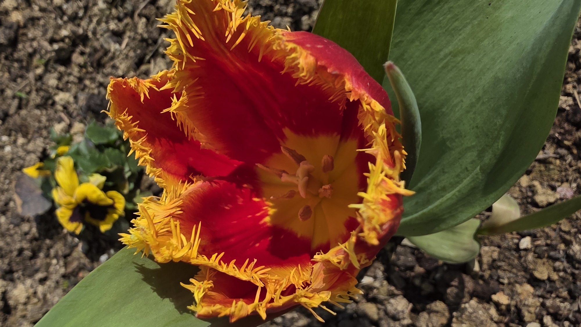 The image displays a close-up, top-down view of a single fringed tulip in Yablanitsa, Bulgaria. The prominent tulip features red petals with distinct yellow and orange serrated or fringed edges. The flower is open, revealing a yellow interior with visible pistil and stamens. Two broad, dark green leaves are positioned beneath and to the side of the tulip. The background consists of dark brown, textured soil containing small stones. A single, out-of-focus yellow pansy with a dark purple center is visible in the upper background. The scene is illuminated by strong natural sunlight, casting subtle shadows.