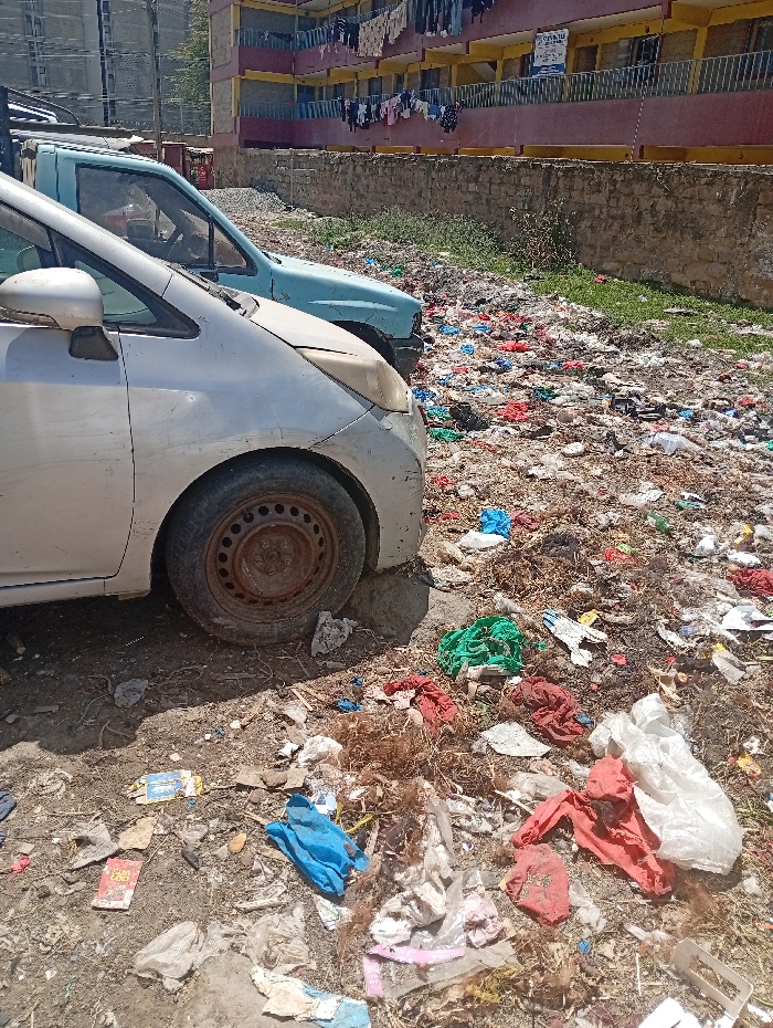 The image depicts an outdoor urban scene in Nairobi, Kenya, characterized by significant refuse accumulation adjacent to residential structures. In the foreground, a silver or light grey hatchback vehicle is partially visible on the left, parked on unpaved, dirty ground. Its front wheel features a rusted steel rim. Behind it, a light blue pickup truck or SUV is partially visible. The ground extending from the immediate foreground to the midground is densely covered with a wide array of litter, including discarded plastic bags (white, blue, red), pieces of fabric (green, red, blue), cardboard, paper wrappers, and other mixed debris, intermingled with dry soil and sparse vegetation. In the midground, a low stone wall, constructed from irregular rocks, separates the heavily littered area from a slightly elevated patch of unkempt grass. Beyond this wall, in the background, stands a multi-story residential building with a reddish-brown lower facade and yellow banding on upper levels. Multiple balconies are present, from which various items of clothing are hung on clotheslines to dry. A white sign with blue text is visible on an upper-level balcony. To the far left in the background, another taller, multi-story building with a concrete-like facade is partially visible. The scene is illuminated by natural daylight, and no individuals are present.