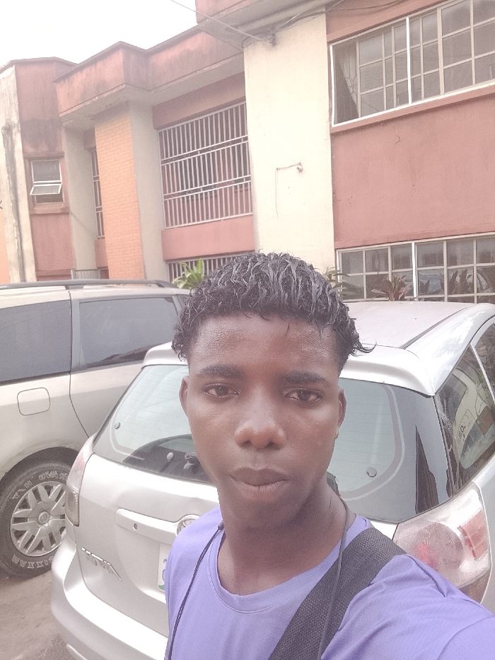 A young man poses for a selfie outdoors. He has short, dark, wet hair and is wearing a light purple t-shirt with a black strap across his chest. Behind him are two parked cars, a silver hatchback and a minivan. A building with multiple windows and a beige/pink facade is visible in the background. The sky is overcast, casting a soft light on the scene. The subject is looking directly at the camera.