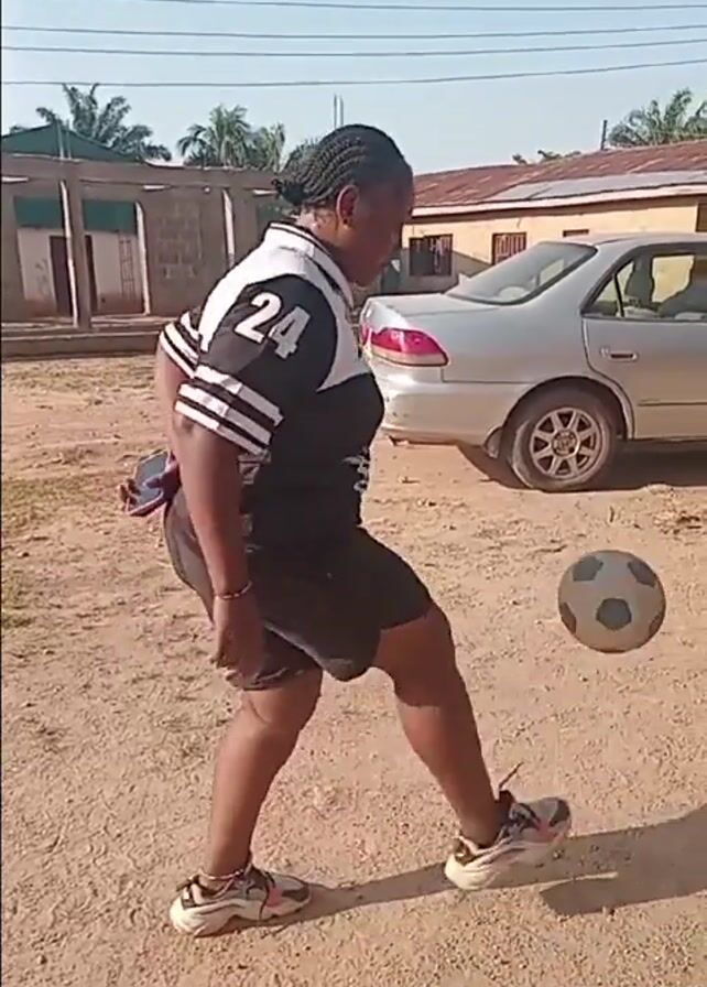 A person in a black and white soccer jersey and black shorts juggles a soccer ball outdoors on a dusty patch of land. The person is facing the camera and is in the middle of kicking the ball up. In the background, there is a silver car, some buildings, and trees. The person takes a step after juggling the ball before the video ends.