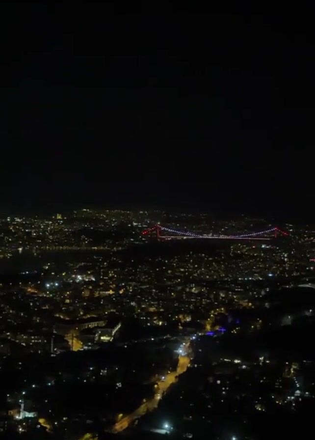 nighttime cityscape. The scene is dominated by the lights of the city stretching out beneath a dark sky. In the distance, a bridge is illuminated with a mix of red and blue lights. The perspective is from an elevated position, looking down on the sprawling urban landscape. There is no people are objects identifiable in the video other than the cityscape and bridge.