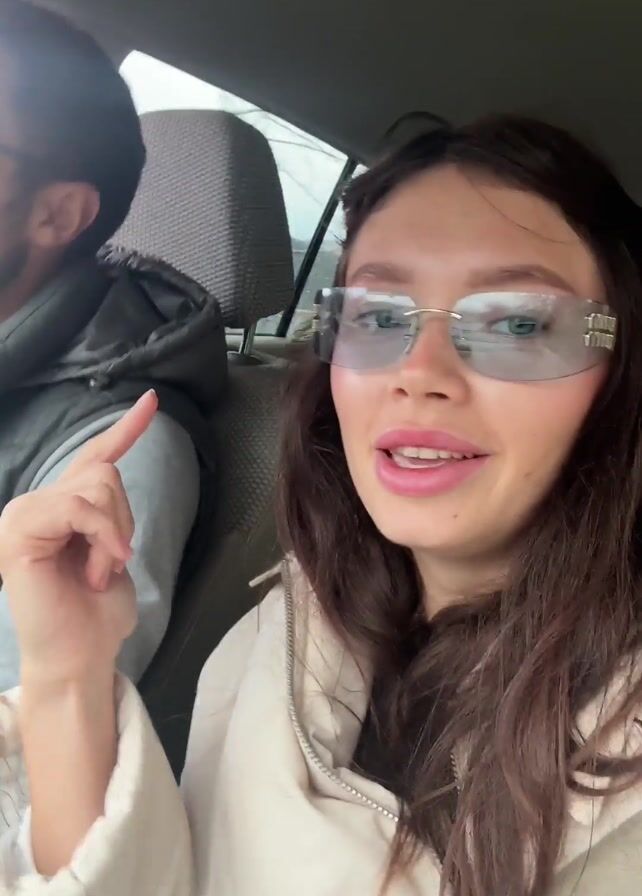 A young woman with long brown hair, wearing reflective silver sunglasses and a cream jacket, sits in the passenger seat of a car. She looks at the camera and speaks. The male driver, who is wearing glasses, a gray hooded sweatshirt, and a dark gray vest, sings and gestures emphatically. The car is in motion, as suggested by the blurring background. The car's interior is visible.