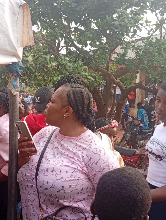 A crowded outdoor scene features multiple individuals of various ages. A woman in a pink patterned shirt is prominent in the foreground, holding a smartphone. Behind her, a child with a headband peers out. Other people are visible, including a person in a red shirt and a black cap. A motorcycle is parked nearby. A large tree with dense foliage fills the background. The overall impression is one of a busy and populated area.