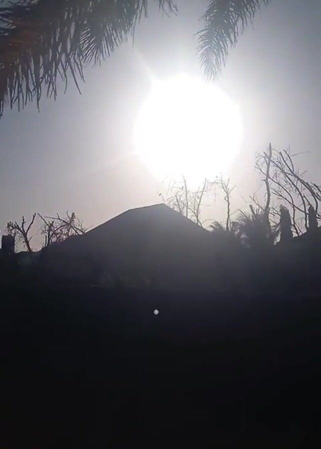 The scene is a sun-drenched, heavily backlit view of the sun shining intensely through palm fronds and silhouetted trees. A dark, undefined foreground obscures details, but a building-like structure is vaguely visible against the bright light. The sky is light and washed out by the brightness of the sun.