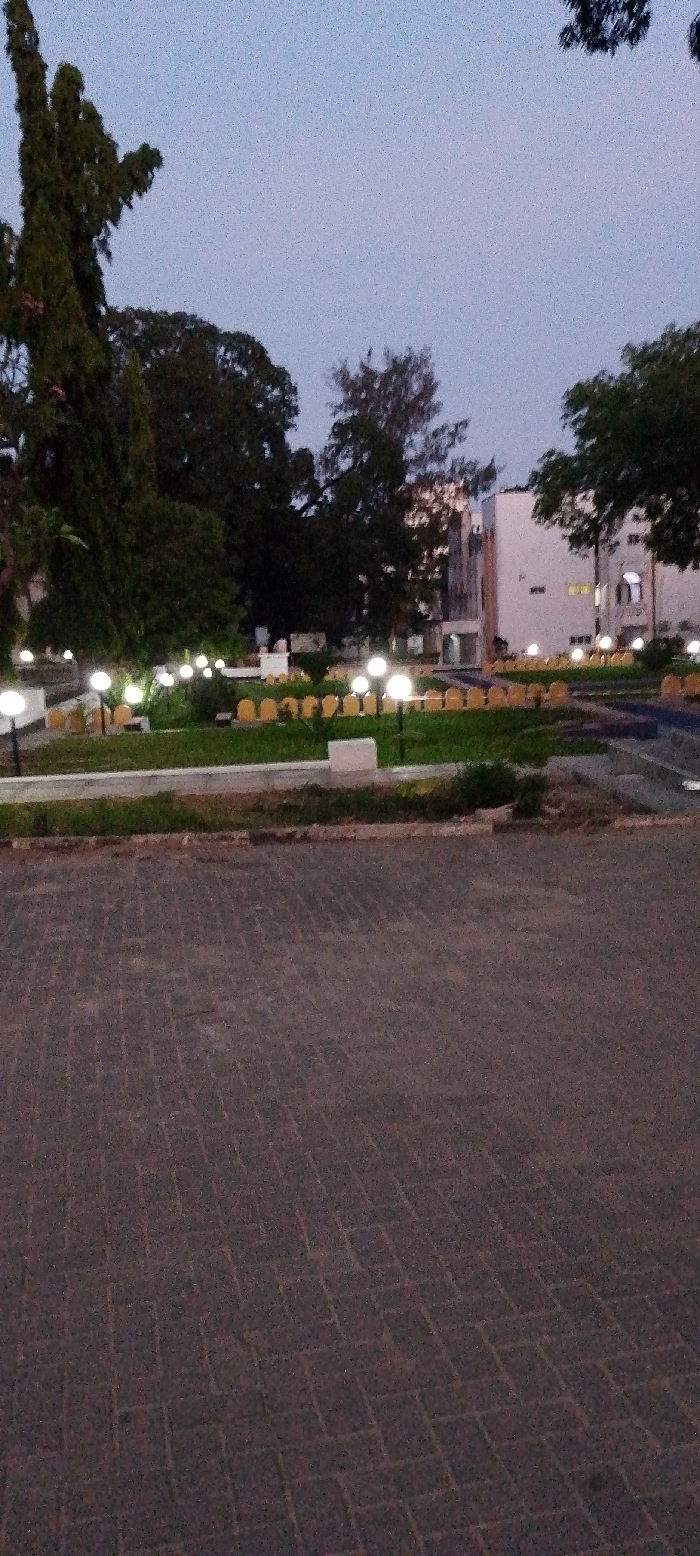 The image captures an outdoor scene at dusk or dawn in Tudor ward, Kenya. In the foreground, a dark-colored, rectangular-patterned paved surface is visible. This surface transitions to a low, light-colored concrete curb, separating it from a landscaped area. The midground features a garden with green grass and numerous spherical, illuminated outdoor lights mounted on short poles. Behind these lights, a curved arrangement of yellow, arch-shaped elements is present. Dense, dark-foliage trees occupy the left and central portions of the midground and background. On the right side of the background, a multi-story, light-colored building with several illuminated windows is visible. The sky above is a light blue-grey. No individuals or discernible activities are present.