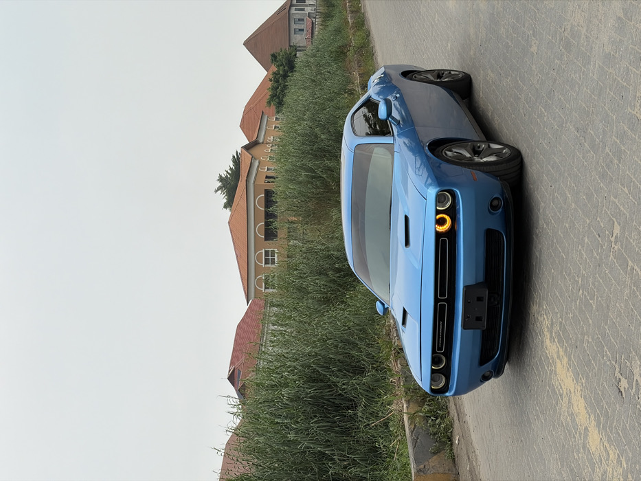 A light blue Dodge Challenger is positioned at a slight angle on a paved road composed of light-colored interlocking pavers in Igboefon, Nigeria