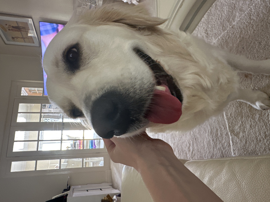 The scene depicts a domestic interior. A cream-colored Golden Retriever with dark eyes and an extended pink tongue occupies the foreground, its left cheek being petted by a fair-skinned human hand. In the background, double French doors composed of multiple glass panes allow bright natural light into the room, evidenced by a rainbow reflection across their lower section. A wall-mounted flat-screen television displaying colorful, indistinct imagery is visible on the right, beneath a framed picture depicting three figures. The floor is covered by light-colored carpet. Sections of white upholstered furniture are present on the left side of the frame, and a white cabinet is partially visible in the far left background. The architectural and interior details are consistent with residential properties, but the image lacks specific visual landmarks or contextual information to confirm its location within London, United Kingdom.