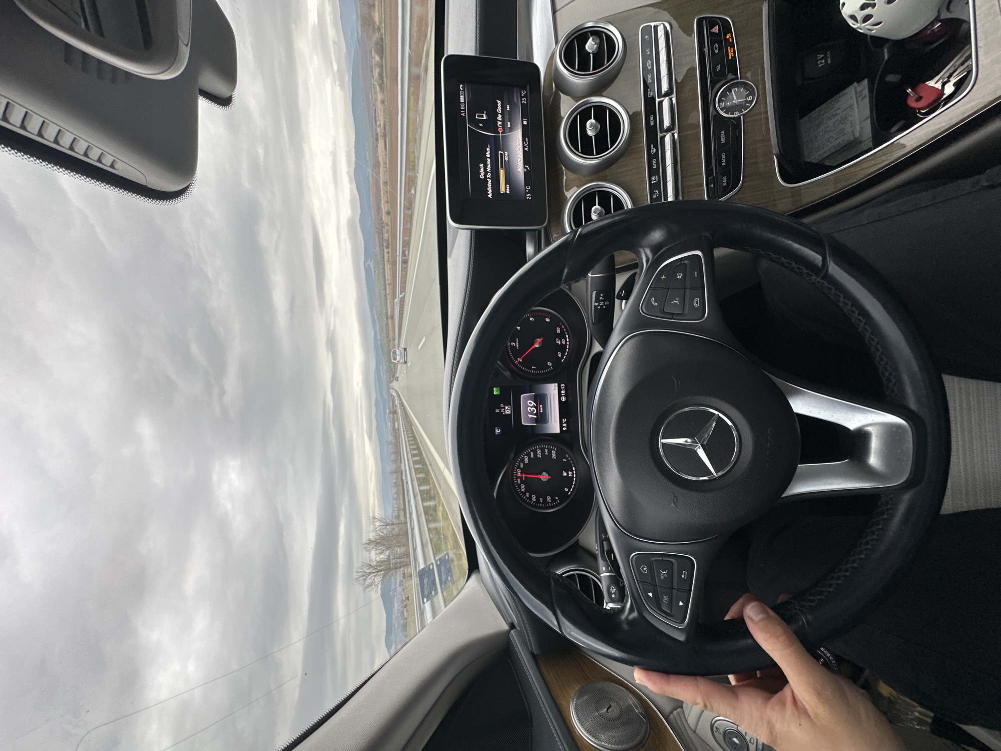 Here's a detailed description of the image: **Scene:** The image is taken from the interior of a Mercedes-Benz, looking through the windshield while the vehicle is in motion on a highway. The speedometer reads 139 km/h, and the outside temperature is 9.5°C. The in-car entertainment system displays that music is playing, indicating the song is "I'll Be Good" on Blagoy's iPhone. The dashboard clock reads 18:13. **Environment:** The vehicle is traveling on a highway with multiple lanes. The landscape visible through the windshield includes flat land with some trees and hills or low mountains in the distance. The sky is overcast with heavy cloud cover. **People:** A person's hand is visible on the steering wheel, indicating someone is driving the car. **Objects:** Key elements visible include the Mercedes-Benz steering wheel, dashboard, in-car entertainment screen, speedometer, air vents, and various car controls. A white decorative object sits in a storage area. Keys and documents are also visible in the same area. **Location:** Although not explicitly stated, the in-car entertainment screen shows that the vehicle is likely traveling near Delyan, Bulgaria, given the BG region code A1. **Actions:** The primary action is driving a car on a highway.